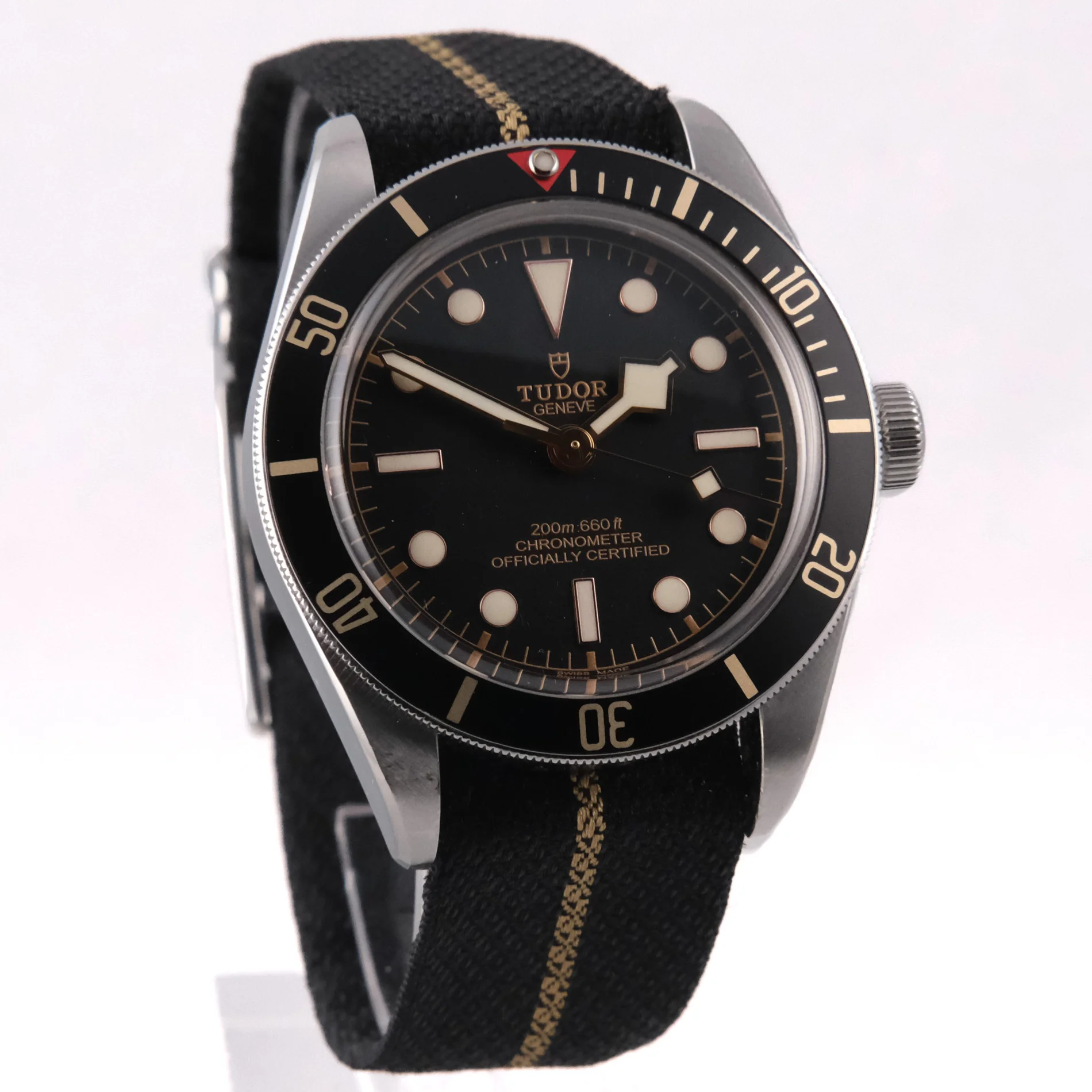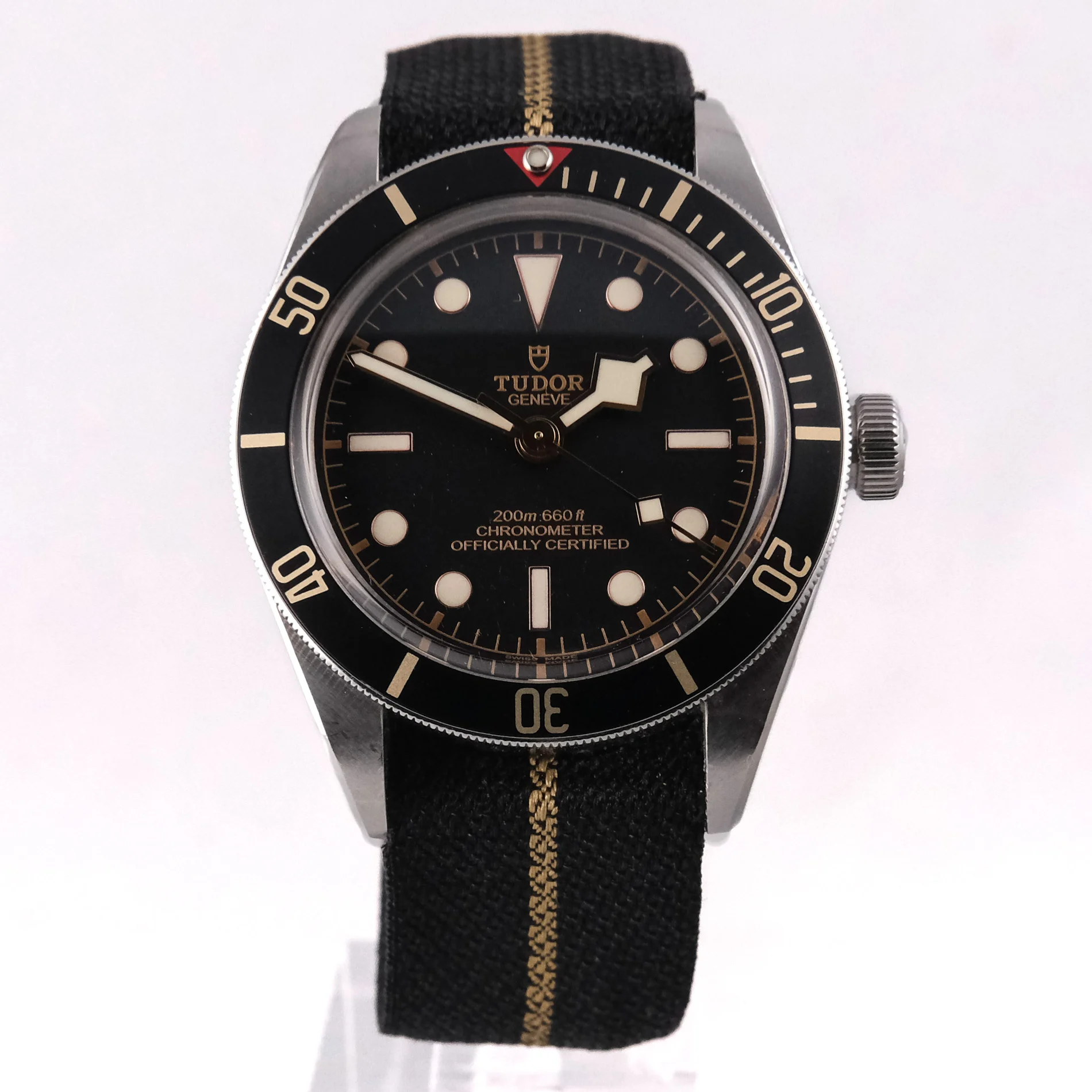 Bracelet/ Strap: Both original woven Tudor black and gold strap, and unworn brown leather strap with original Tudor clasp.