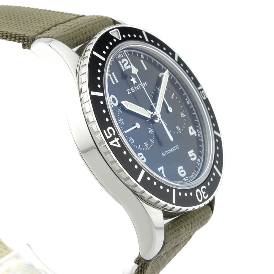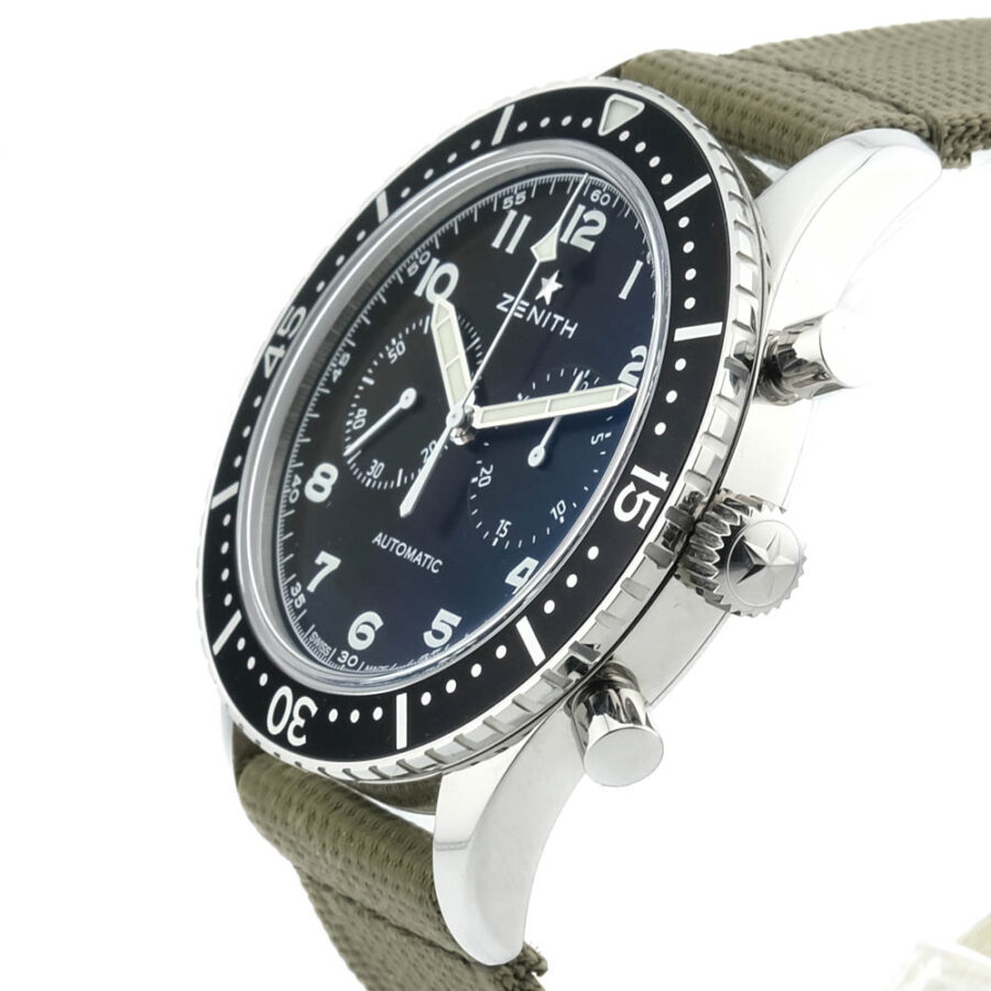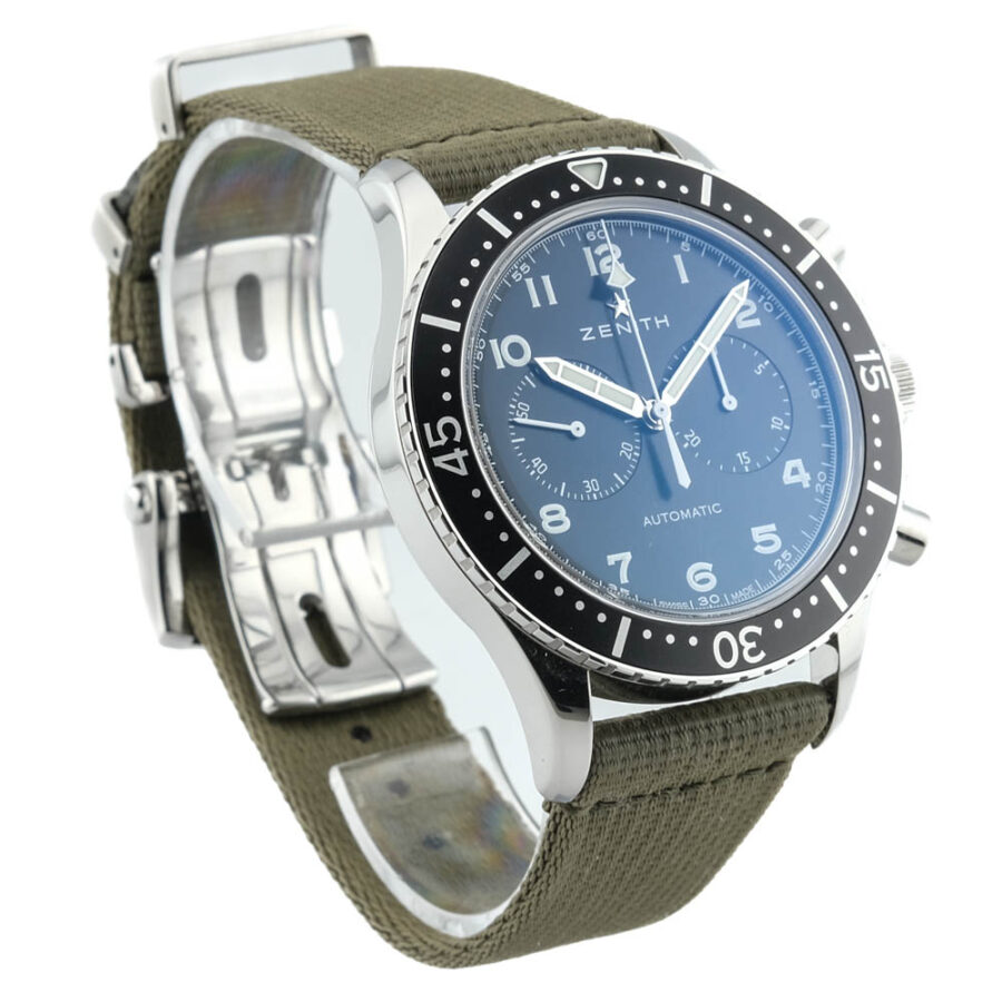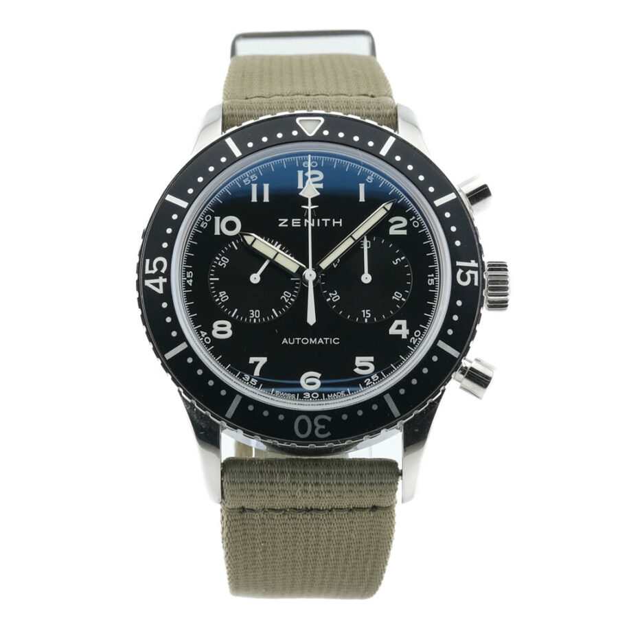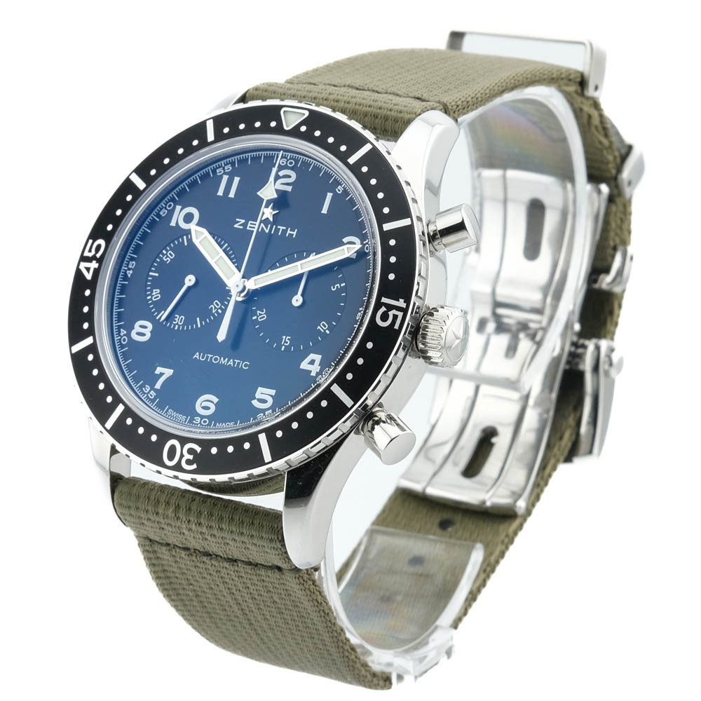 Offered as a full set with all box and papers, and both the fabric strap shown and black leather band with folding Zenith clasp as originally supplied with this edition, this is a beautiful pilot’s chronograph, with a first class movement, ready to wear with huge vintage appeal.